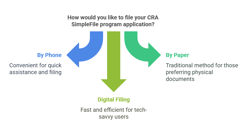 The CRA’s SimpleFile program offers multiple convenient options to suit different needs and preferences. Let’s break down the available methods: SimpleFile by Phone, SimpleFile by Paper, and SimpleFile Digital.