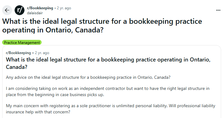 One common question that often comes up among Ontario business owners is: “What is the ideal legal structure for a bookkeeping practice operating in Ontario, Canada?” In a recent Reddit discussion, professionals shared their real-world experiences and advice, here’s a look at what they had to say.